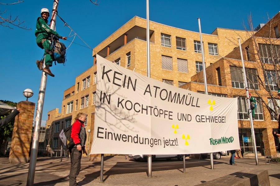 Robin Wood-Banneraktion vor dem UM am 13.2.2015 - Bildausschnitt. Foto: Robin Wood, Jens VolleWer unsere Forderungen nach mehr Verantwortung und Sicherheit beim Abriss der AKWs und beim Umgang mit dem Atom- und Abrissmüll unterstützen will, kann dies wie Robin Wood mit einer Kletteraktion vor dem Umweltministerium in Stuttgart tun: "Kein Atommüll in Kochtöpfe und Gehwege!" (Danke, Robin Wood! Foto: Robin Wood / Jens Volle. Video bei Fluegel.TV, Presseinfo bei Robin Wood).